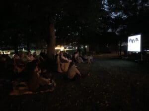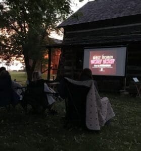 The Sheboygan County Historical Museum hosted it’s first ever Outdoor Movie Night on July 12, 2019. There was so much anticipation leading up to the night and we were thrilled with the turn out! All ages and generations came out to enjoy Singin’ in the Rain (1952), including families with younger kids and teens, and young couples on dates – cue the aww factor! Everyone enjoyed popcorn while watching cartoons and our feature film in front of the historic 1864 Weinhold Log Cabin. We started the night with free admission to the Museum for those that came early at 7:30pm. An hour later we watched a few old fashioned Mickey Mouse Cartoons. Then finally after much anticipation, dusk completely fell and it was time to start our featured film!