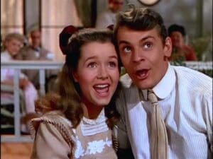 Donald O’Connor was brought to MGM to replace Oscar Levant who co-stared with Kelly in An American in Paris and was supposed to play his best friend Cosmo in the new film. O’Connor brought a young, charismatic quality to the role. He too was an experienced performer going back to his childhood. He was born into a family of Vaudeville performers. His parents were both former circus performers and their acrobatic and dance talents were passed down in the family, as evidenced in “Make Em Laugh.” Critics agreed that O’Connor, along with his costar, Jean Hagon who plays the funny voiced Lina Lamont (spoilers, her voice does not sound like that in real life. I saw her on Make Room for Daddy and The Andy Griffith Show and had no idea at first she was the same person because her voice was so deep) stole the show in the movie.