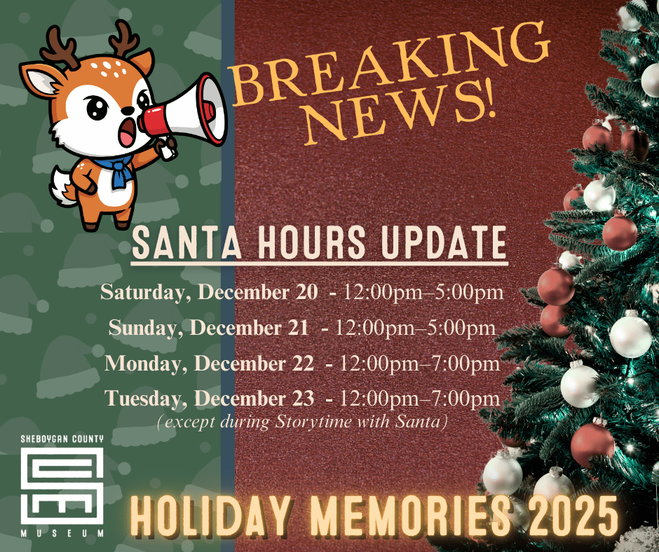 Santa has penciled stops at the Sheboygan County Museum into his very busy schedule to spend some special time with YOU during Holiday Memories 2025. Bring your lists and favorite drawing to talk with the season’s favorite jolly guy.